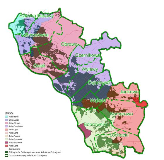 Nadleśnictwo swym zasięgiem obejmuje sześć gmin wiejskich (gm. Lubicz, gm. Czernikowo, gm. Obrowo, gm. Bobrowniki, gm. Lipno, gm. Fabianki) oraz gmin Miasto Lipno i Miasto Toruń.